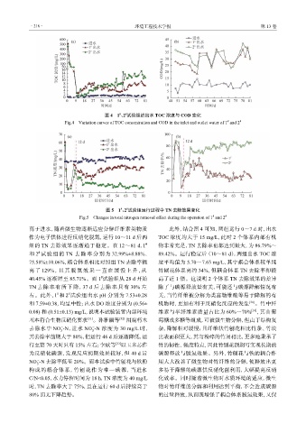 40.45 % 逐渐增 至 85.71%。 而 1 试验组 从 28 开始 高了 近 1 倍。这说 明 2 个体 系 T N 去除效果的差异