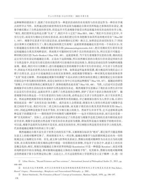 显现。据此,我们可以大胆断言:进行着超越论反思的现象学自我不实行存在设定,不生活于自然态度