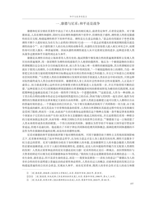 康德和尼采分别在其著作中表达了对人类未来的相反观点,前者肯定和平,后者肯定战争。对于康