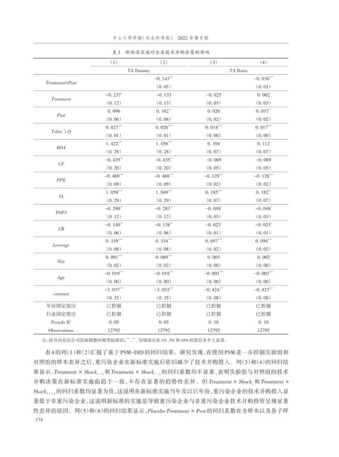 对照组的样本差异之后,重污染企业在新标准实施后依旧减少了技术并购投入。列(3)和(4)的回归结