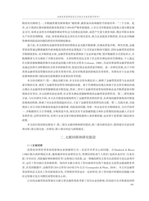 本文的贡献如下:第一,理论贡献方面,本文从社会资本理论切入,解释了金融背景高管与企业高质