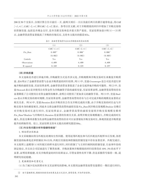 量,表 6列示了金融背景高管与企业并购质量的回归结果,列(1)中,变量 Crossmerger是公司是否进行异
